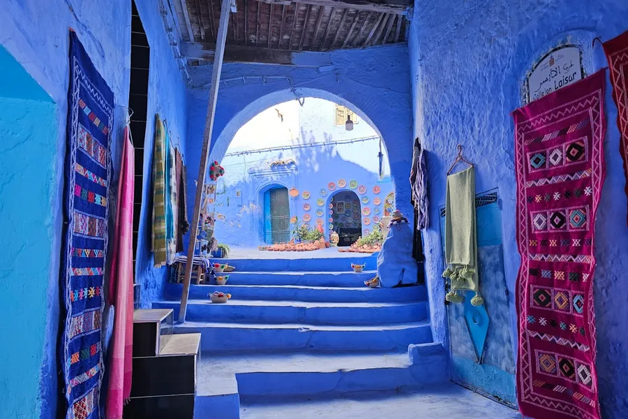 Train from Marrakech to Fes (DH 195–325, 7 hrs). Fes el-Bali is the world's largest car-free urban area — 9,500 lanes and alleys. The tanneries (free from shop terraces, hold mint to your nose), Bou Inania Madrasa (DH 30), and the Merenid Tombs (free, sunset views) are highlights. Hire a guide for the first day (DH 300–400 half-day) or you will genuinely get lost. Bus to Chefchaouen (DH 75, 4 hrs) — the blue city. Every building, wall, and staircase is painted shades of blue. Hike the Rif Mountains, visit the Spanish Mosque at sunset (free, 30-min walk), and relax — Chefchaouen is made for slow days. Riads from DH 150–300/night.